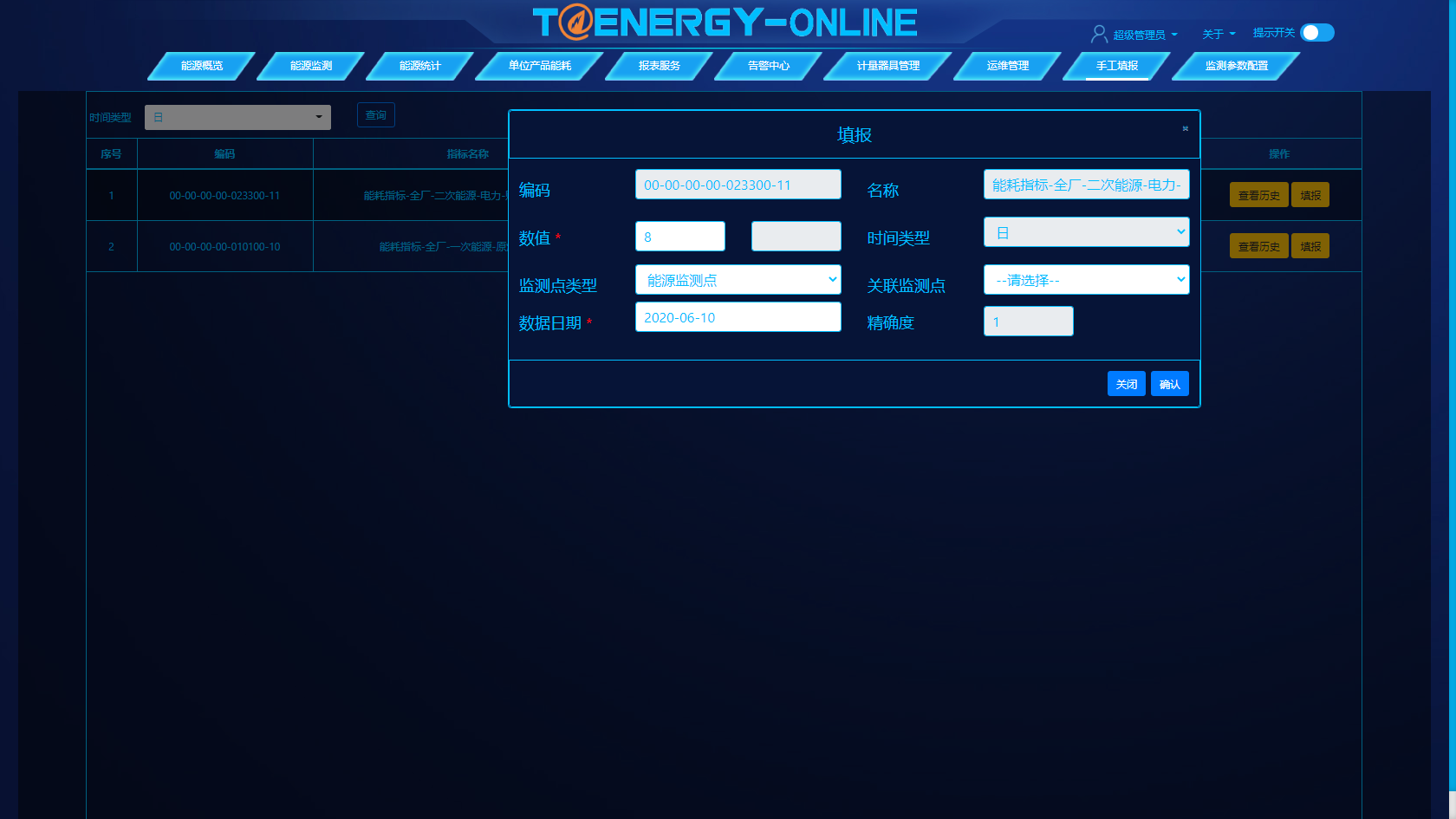 速览企业多类型能耗用能全貌、单品能耗、设备告警信息、手工填报数据等信息;