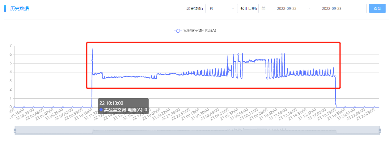 异常用能确认。根据“能源监控—历史数据分析”来进一步确认异常点的异常数据,9月23日的用能异常确实是“嵌入式组-实验室-空调”设备未关机造成的。拉取9月22日至9月23日数据,发现,该嵌入式研发实验室的空调在9月22日上午10点开机后,至次日9月23日下午17点35分左右关机,9月22日未关机。