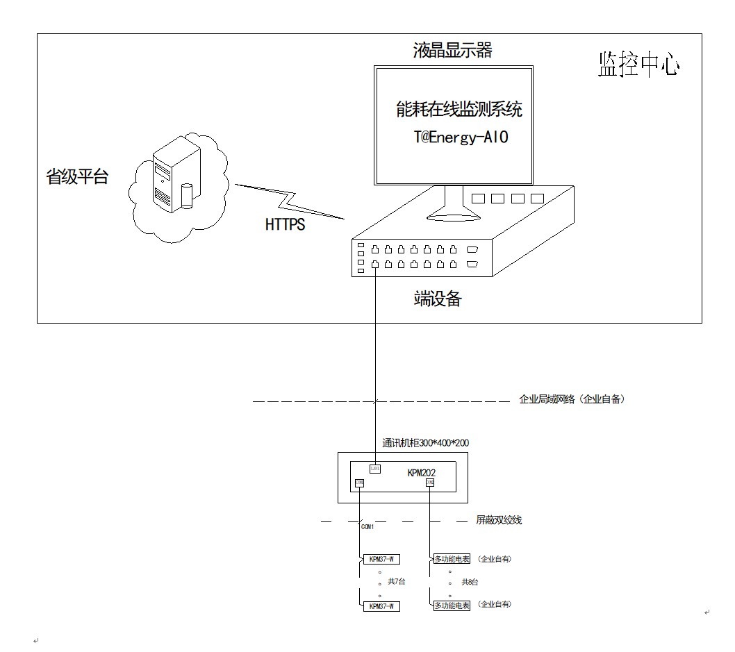 企业配电室内共15个一二级电力监测点,在该配电室内配置1台通信管理机,各电表均通过RS485接口连接屏蔽双绞线将数据传输至通讯管理机,通讯管理机通过企业局域网将数据传输至端设备,企业局域网络由甲方负责搭建。