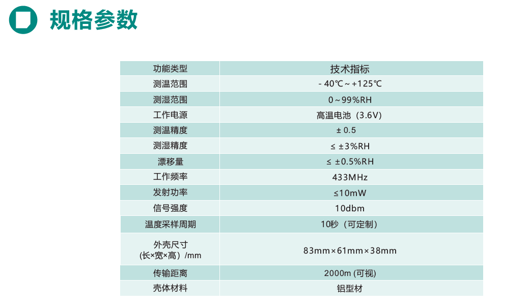 产品采用大容量电池供电方式,集成低功耗、抗干扰、无线加密、传感技术于一体。产品结构材料选用热稳定性高的铝型材,保证了在复杂环境下工作的稳定性和可靠性。