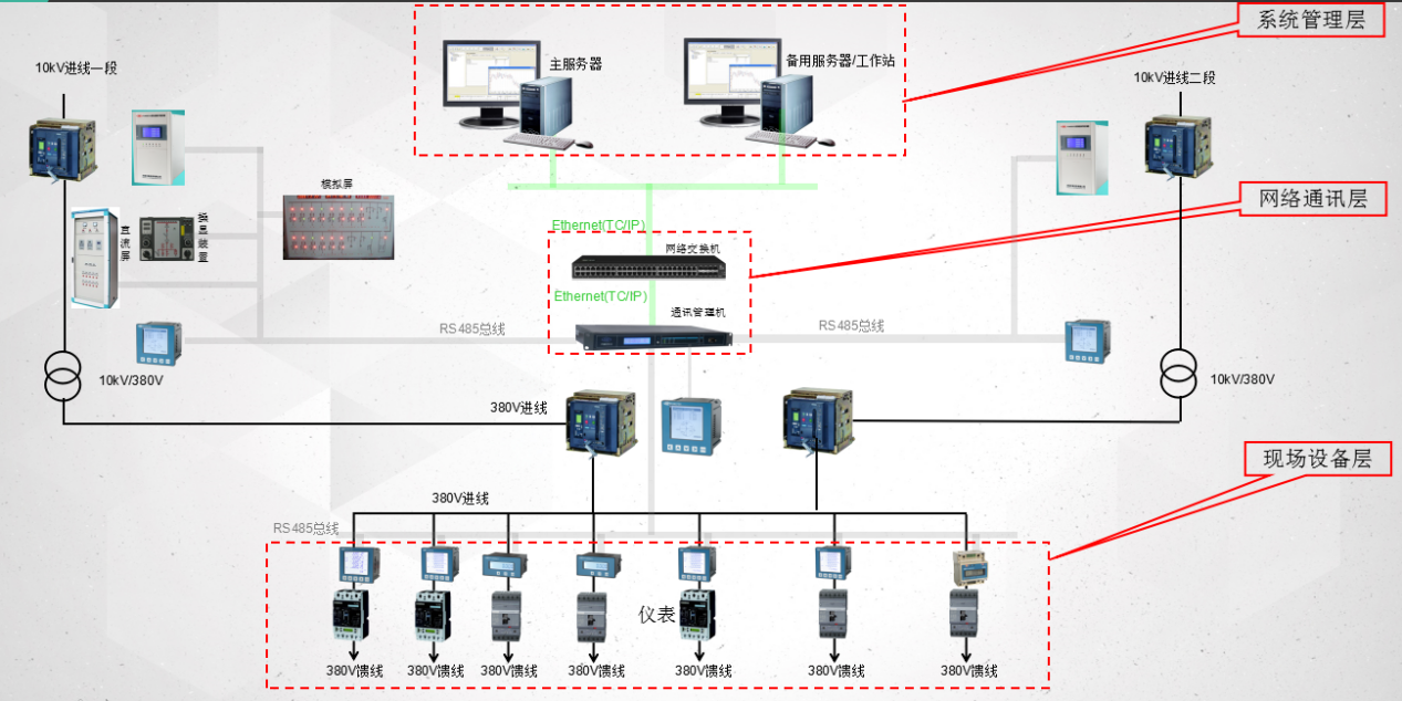 澳门新葡平台的电能管理系统主要分为三层分别为:系统管理层、网络通讯层、现场设备层。