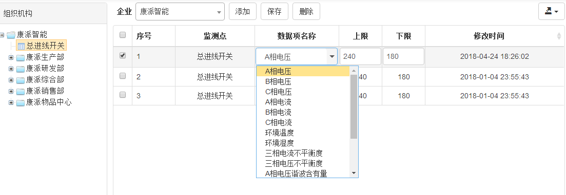 在设备越限设置模块中可自由选择监测部门及监测点,然后根据现场实际情况在组织机构右侧图表中添加变量上下限,如下图所示设置了监测点“总进线开关”的A、B、C三相电压的上下限值。