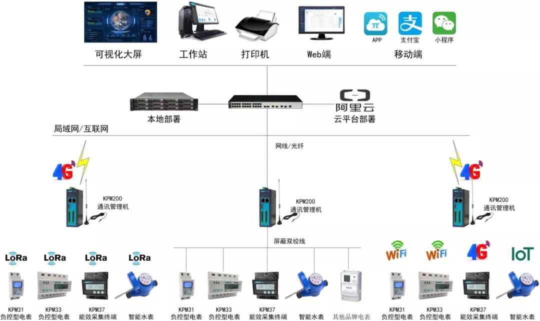 预付费电能管理系统采用分层分布式结构,前端使用智能电表等计量设备实时监测用电数据,通讯管理机将数据上传至云平台/本地服务器进行数据加密处理,通过云平台/本地服务器将加密数据上传至预付费系统后台,实现线上仪表与监控主机的数据连通,完成