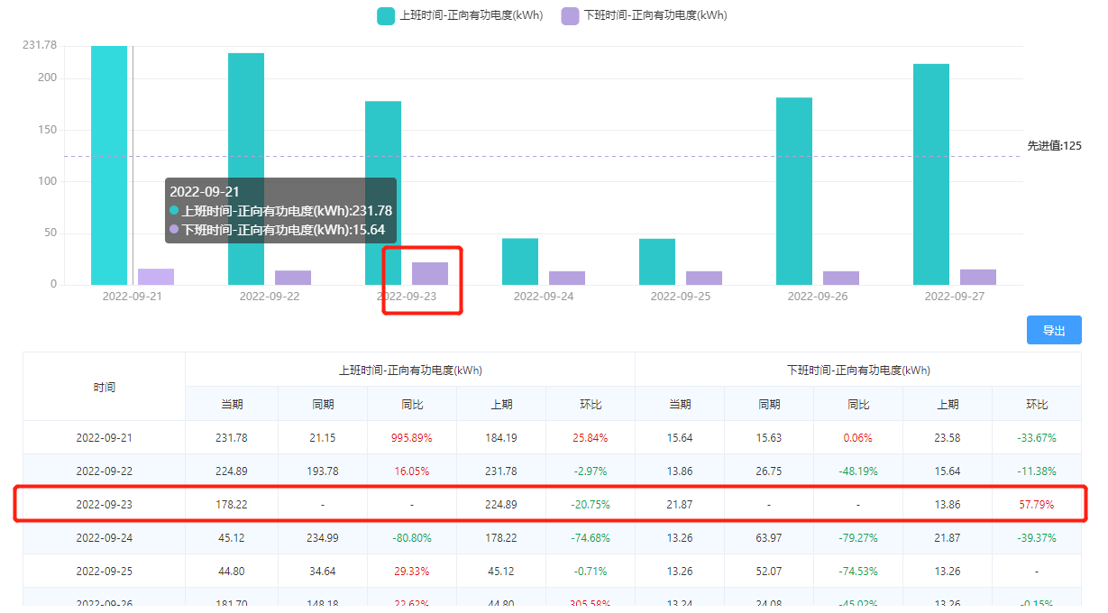 找到异常点。可以通过柱状图和图表,发现9月23日的下班时间能耗要大于一周的平均能耗: