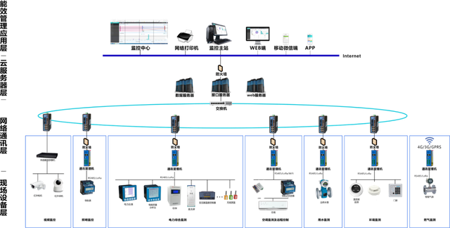 架构设计主要以数据采集系统和数据应用系统为核心,搭建能源综合管理平台,从架构上主要分为现场设备层、网络通讯层、服务器层、能效管理应用层4个部分。