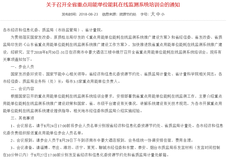 《山东省重点用能单位能耗在线监测系统培训会》通知如下: