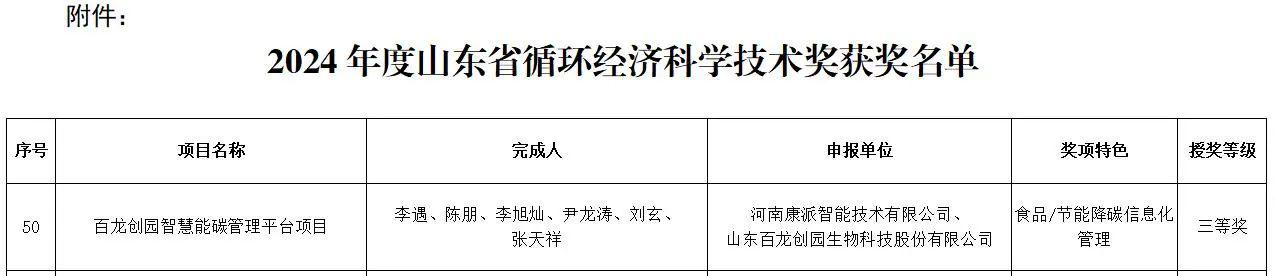 2024年12月18日,山东省循环经济协会组织的“2024年山东省循环经济科学技术奖”评审结果公布,由澳门新葡平台牵头,山东百龙创园生物科技股份有限公司参与落地的《百龙创园智慧能碳管理平台项目》荣获“2024年度山东省循环经济科学技术奖”三等奖。