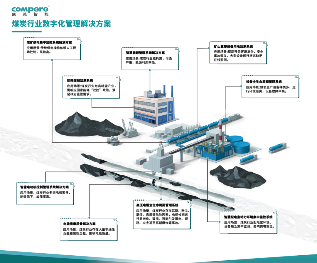 澳门新葡平台以能源管理、碳排放管理、设备全生命周期管理、供配电安全管理的数字化解决方案为核心,搭建新型煤炭行业数字化场景解决方案,助力煤炭企业实现能源的高效利用和安全智能运行管理。