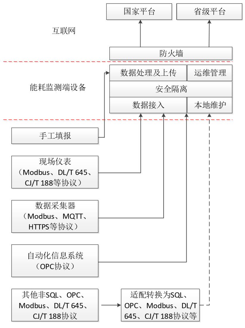 端设备支持SQL、OPC、MODBUS、DL/T 645、CJ/T188协议,能耗在线监测端设备对采集到的数据进行汇总,验证、筛选、整理打包后,采用“CA认证+HTTPS协议+VPN专线”方式多重加密将数据传输至省级平台。